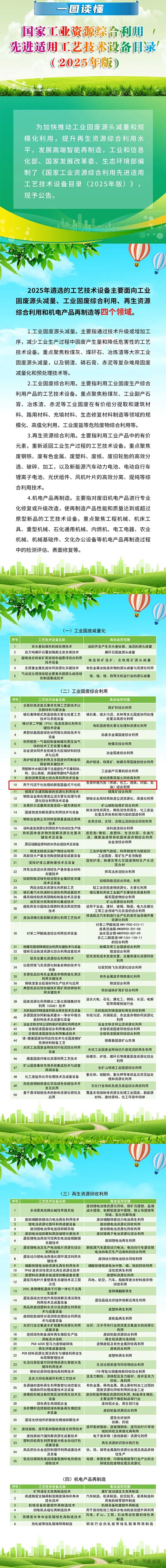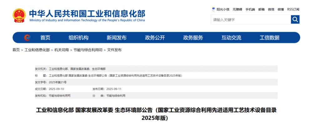 为贯彻落实国家有关部署,进一步加快推动工业固废源头减量和规模化利用,提升再生资源综合利用水平,推动高端智能再制造发展,近日,工业和信息化部、国家发展改革委、生态环境部联合编制并发布了《国家工业资源综合利用先进适用工艺技术设备目录(2025年版)》。该文件的发布,将为行业企业推广应用先进适用技术、加快绿色低碳转型提供有力指引和政策支持。