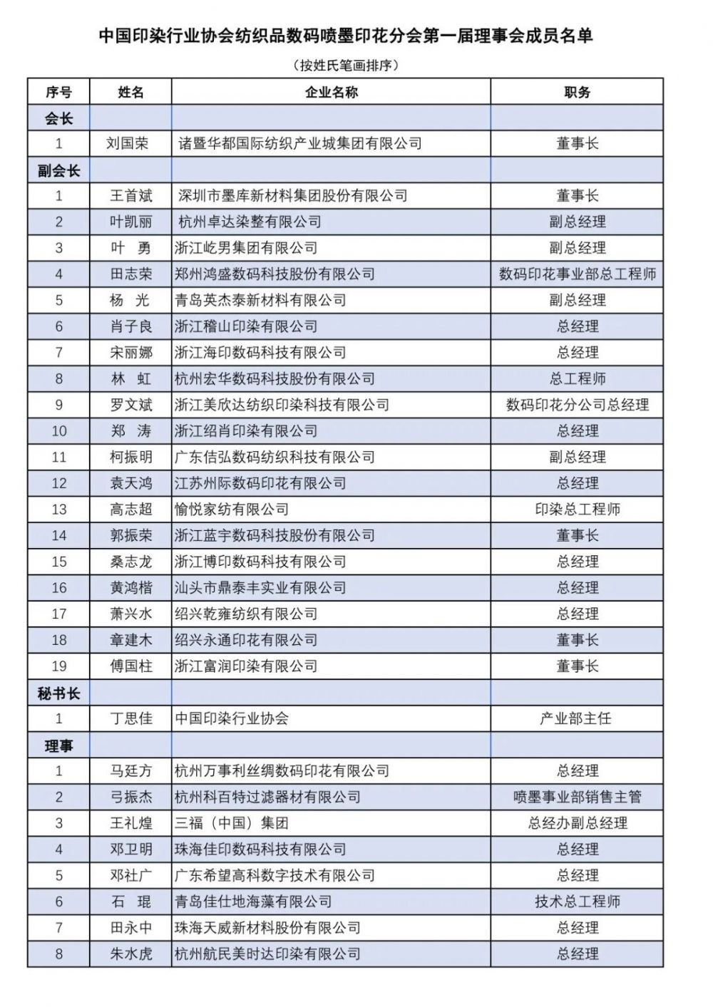 中国印染行业协会纺织品数码喷墨印花分会第一届理事会成员名单