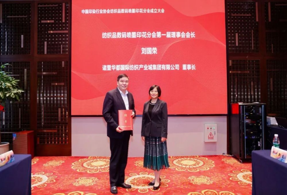 中国印染行业协会会长林琳为纺织品数码喷墨印花分会会长刘国荣颁发了聘书,刘国荣会长为分会副会长、秘书长、理事颁发了聘书。