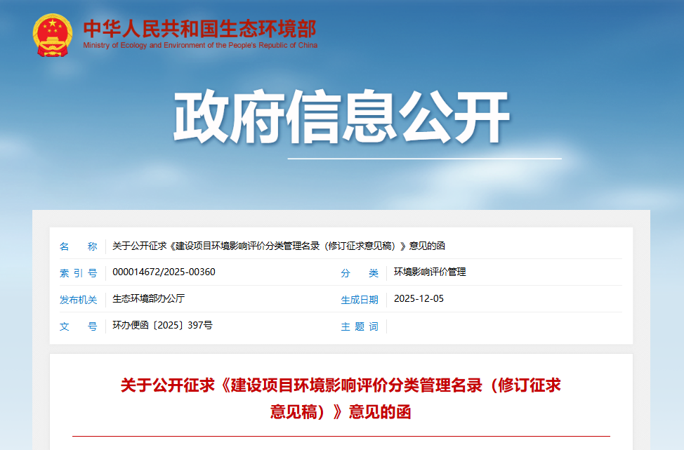 为深入贯彻党的二十大和二十届三中、四中全会精神,进一步深化环境影响评价制度改革,我部决定对《建设项目环境影响评价分类管理名录(2021年版)》进行修订,并起草了《建设项目环境影响评价分类管理名录(修订征求意见稿)》,现公开征求意见。征求意见稿及其编制说明可登录生态环境部网站(http://www.mee.gov.cn)“意见征集”栏目检索查阅。