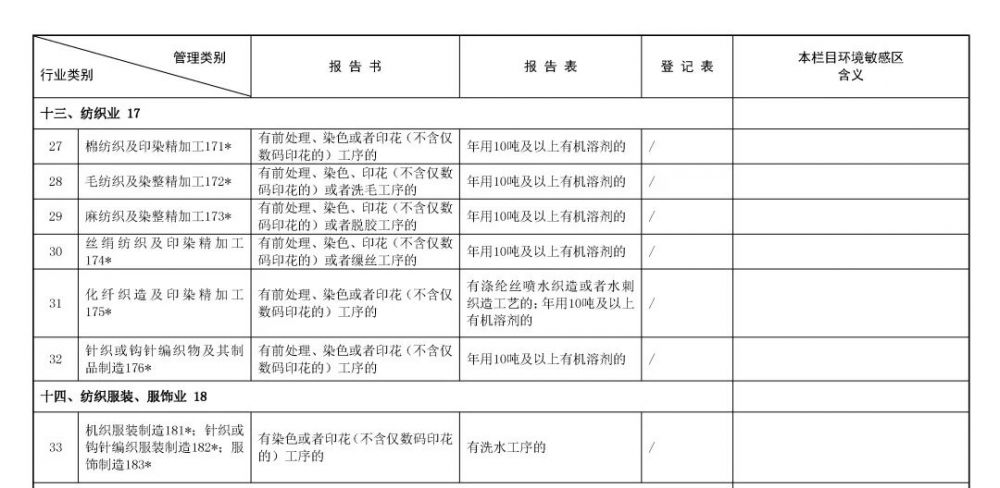 《建设项目环境影响评价分类管理名录》(纺织业)