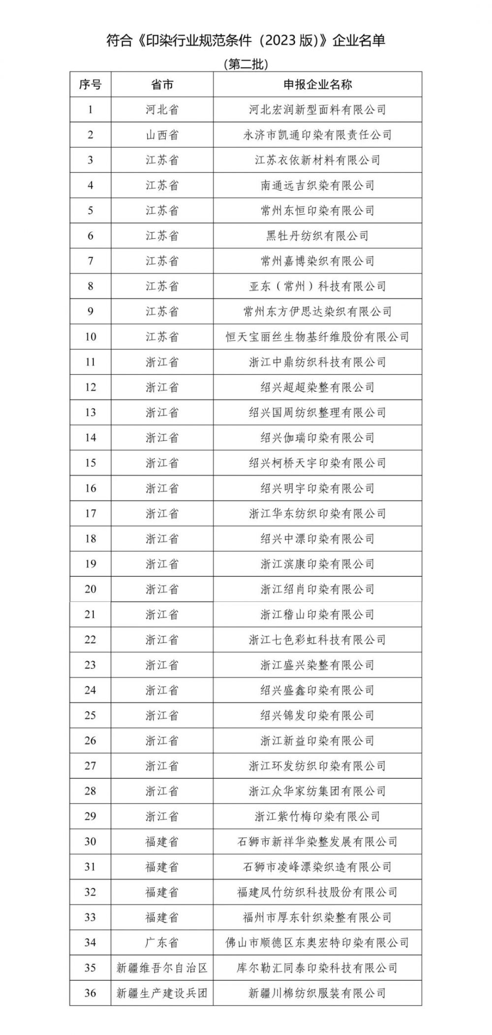 根据《印染企业规范公告管理办法》有关规定,经企业自主申报、省级工业和信息化主管部门核实推荐、专家组评审及征求生态环境部意见、对外公示等程序,现将符合《印染行业规范条件(2023版)》企业名单(第二批)予以公告。
