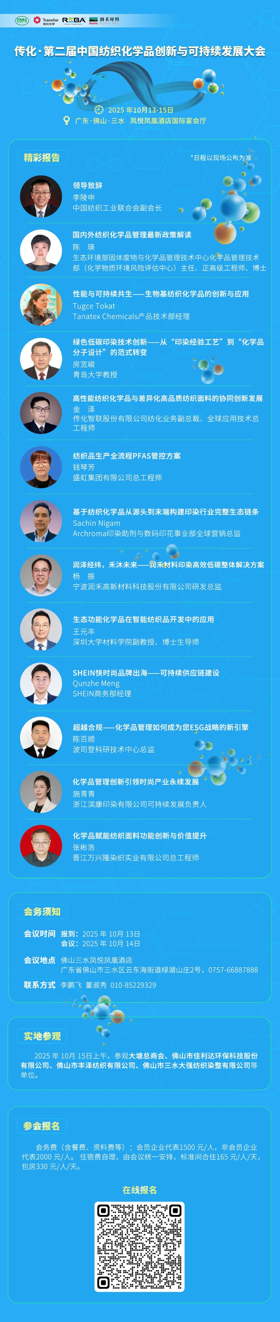 中国印染行业协会定于2025年10月13-15日在广东省佛山市召开“传化·第二届中国纺织化学品创新与可持续发展大会”。会上将发布符合《印染规范条件(2023版)》企业名单(第二批),会议同期召开“中国印染行业协会七届二次常务理事会”和“中国印染行业协会纺织化学品分会成立大会”。