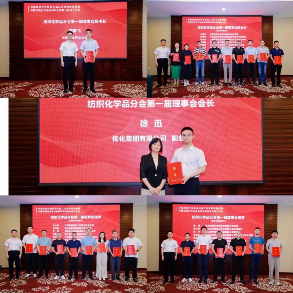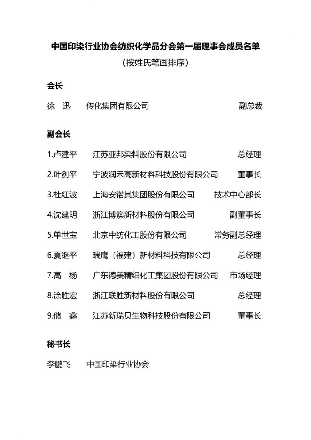 随后大会表决产生了中国印染行业协会纺织化学品分会第一届理事会成员,确定理事30名:传化集团有限公司副总裁、传化功能化学品总裁徐迅担任会长;江苏亚邦染料股份有限公司总经理卢建平等9人担任副会长;中国印染行业协会李鹏飞担任秘书长;江苏德美科化工有限公司总经理王小军等19人担任理事(中国印染行业协会纺织化学品分会第一届理事会成员名单见附件)。